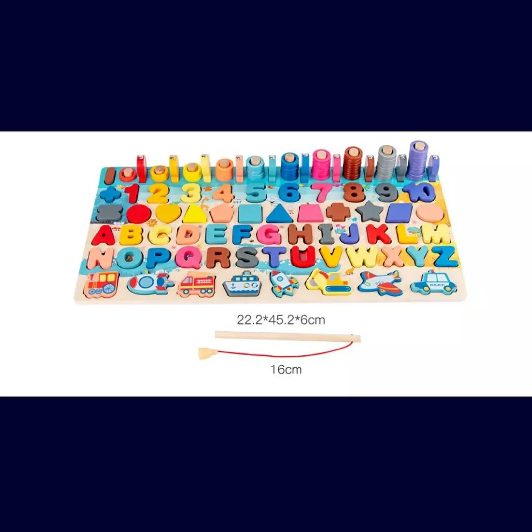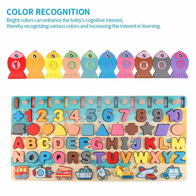 7-in-1 Educational Toy: Combines shapes, numbers, alphabets, vehicles, and an abacus on one board, offering diverse learning activities.