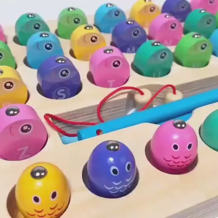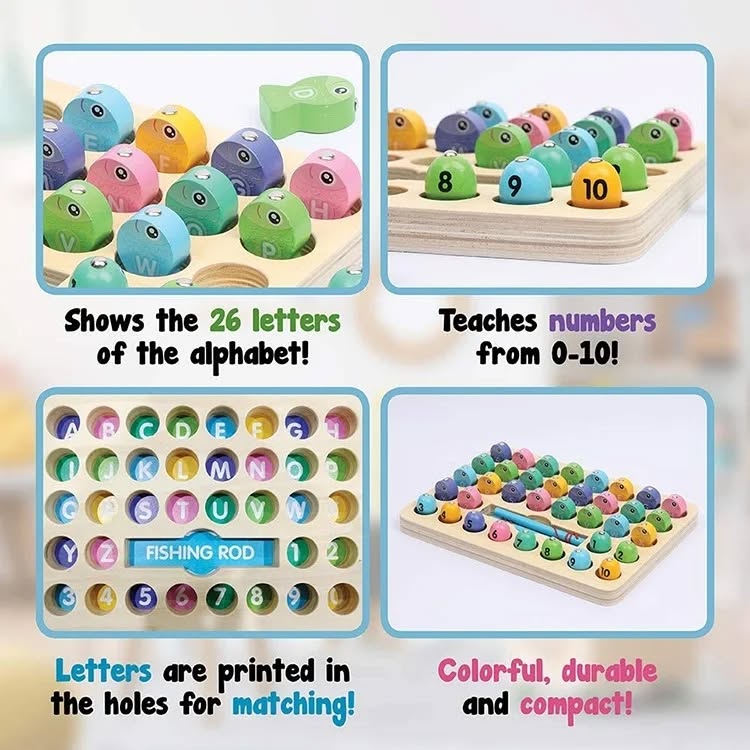 Fishing game for kids - educational fish game for kids with thick and soft wood that contains letters and numbers in small holes. It also includes a small fish that has 26 letters and 10 numbers. This alphabet learning toy also includes 2 wooden fishing poles with gems attached to them to catch fish and place them in the hole.