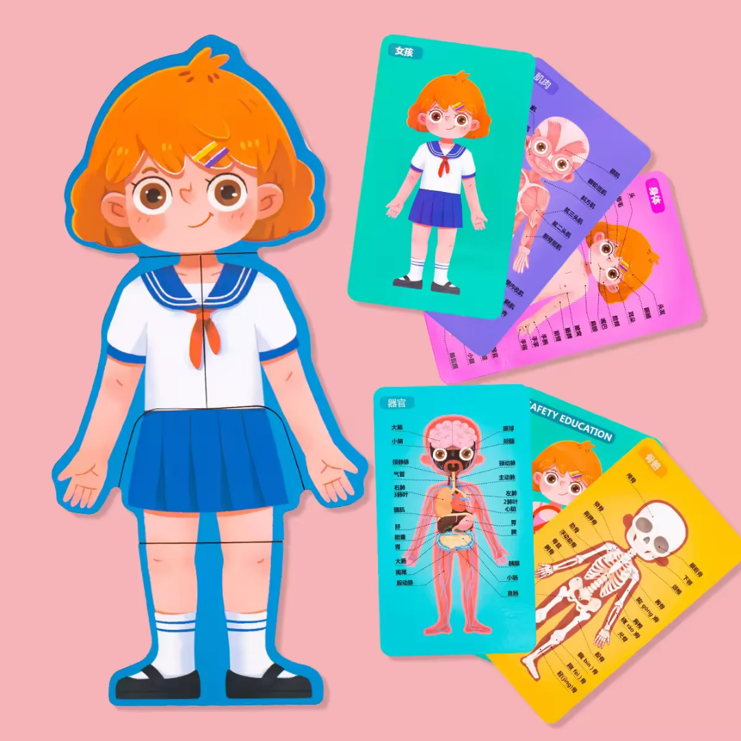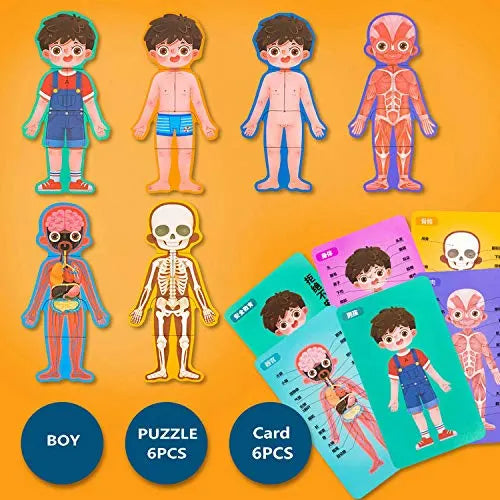 It including 6 pcs jigsaw puzzles with 6 body structure recognition cards in boys and girls. The cards within English human organ explanation, help children recognize their body structure.