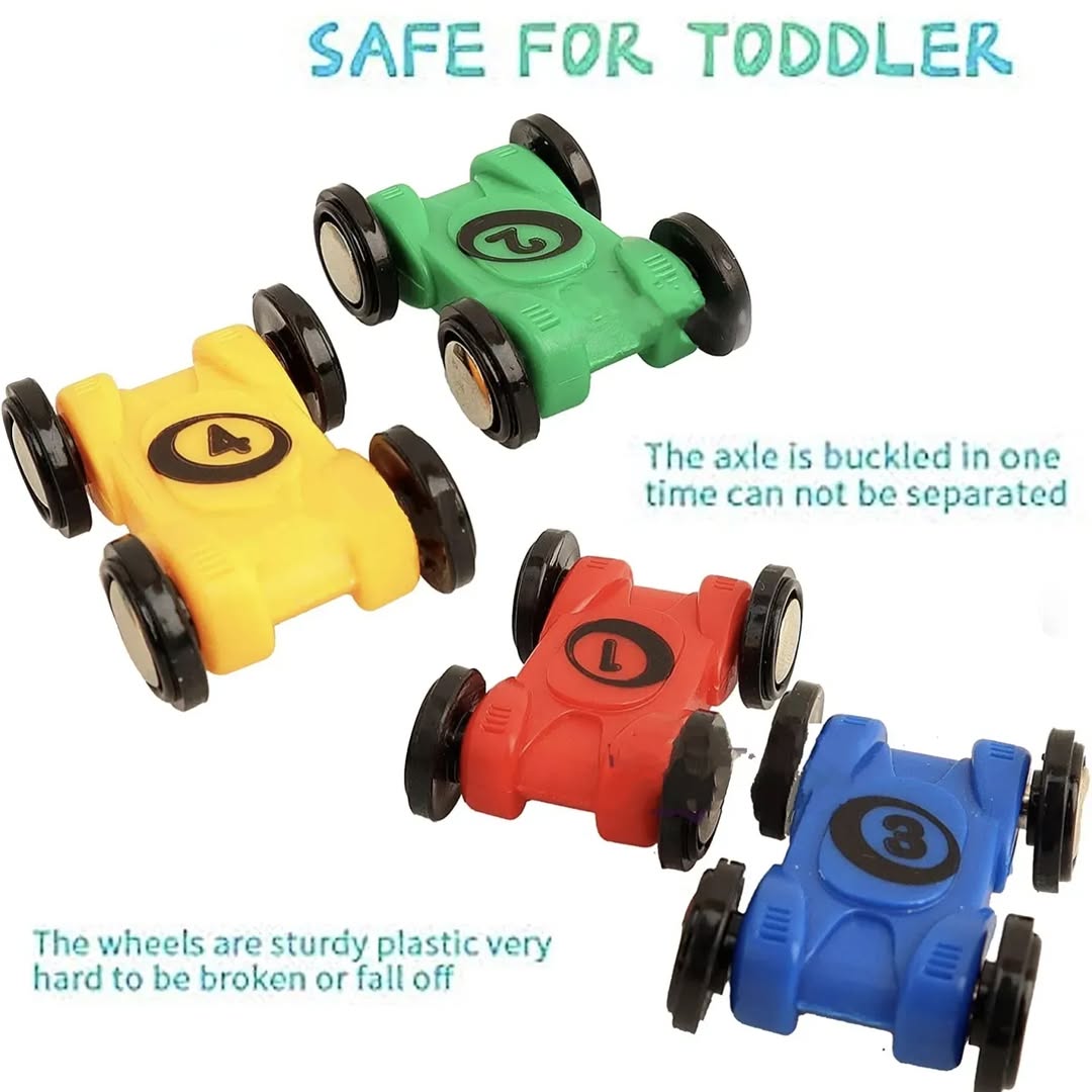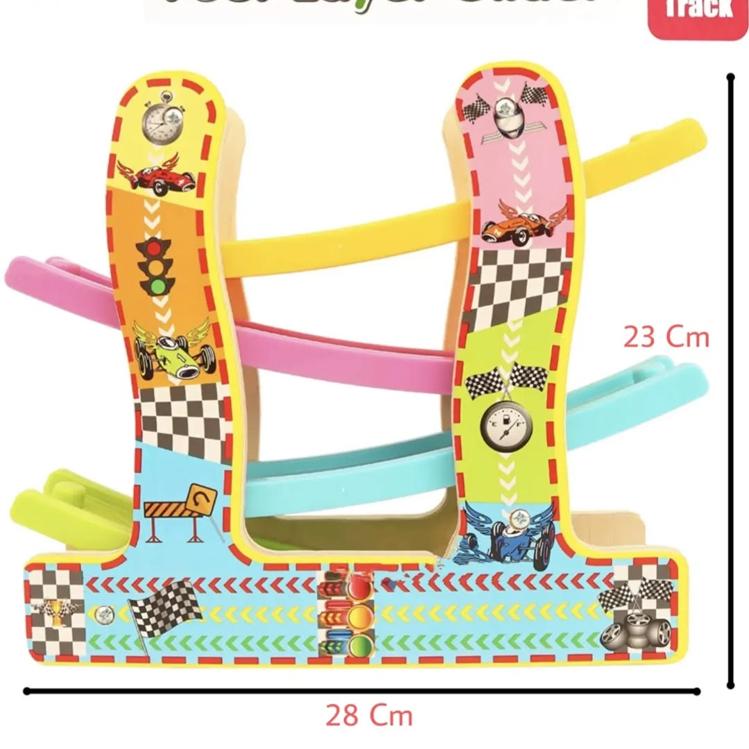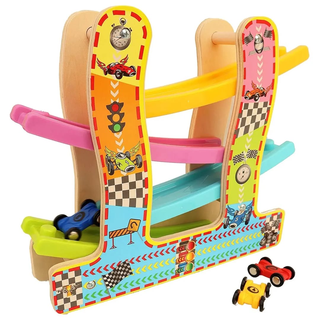 【4 bright ramps】Racer set off from the top parking lot and then slides down the rainbow toddler race track, bringing the toddlers pleasure of racing and improving visuals tracking ability. When the game stops, the toddlers can collect the cars in the top parking lot by themselves.