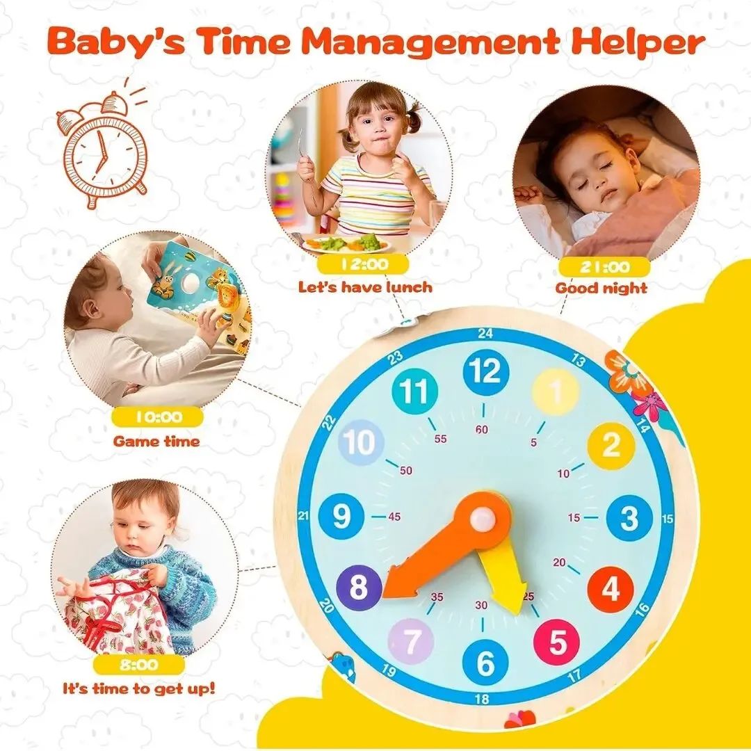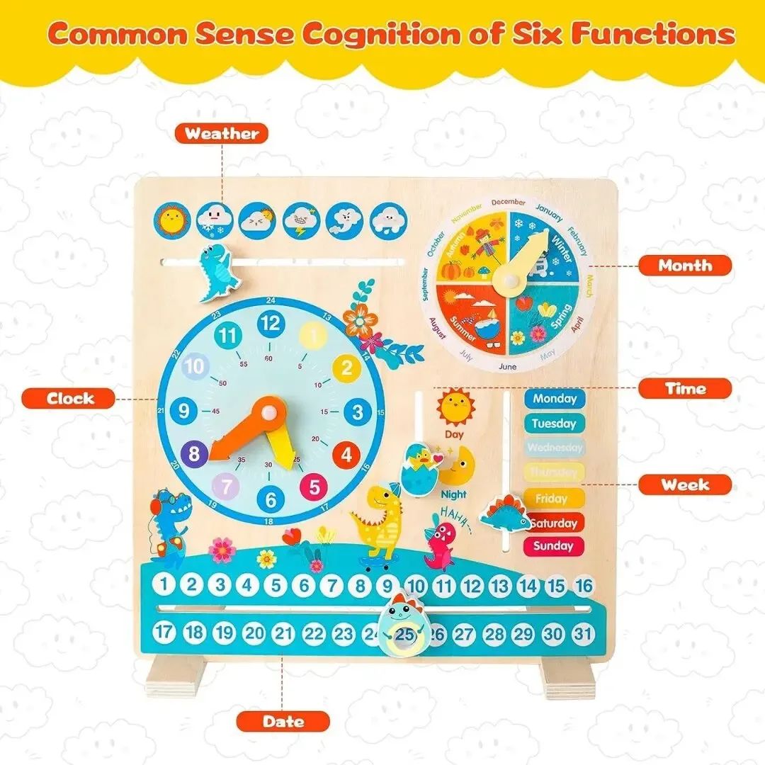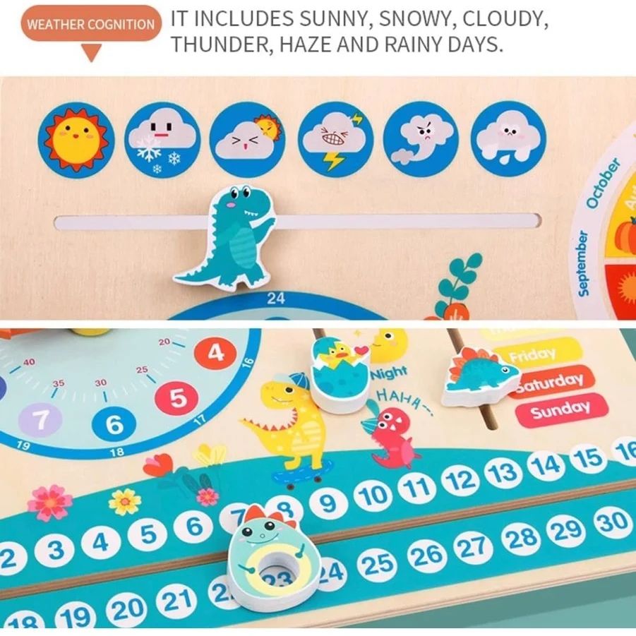 Cognitive Toy : The wooden calendar clock is a cognitive toy that combines the date, day of the week, month, weather, time and seasons. It not only helps children to how to recognise and identify the hour and minute hands, but also familiarise them with the four seasons and the weather conditions of the different seasons. It also teaches children the importance of punctuality.