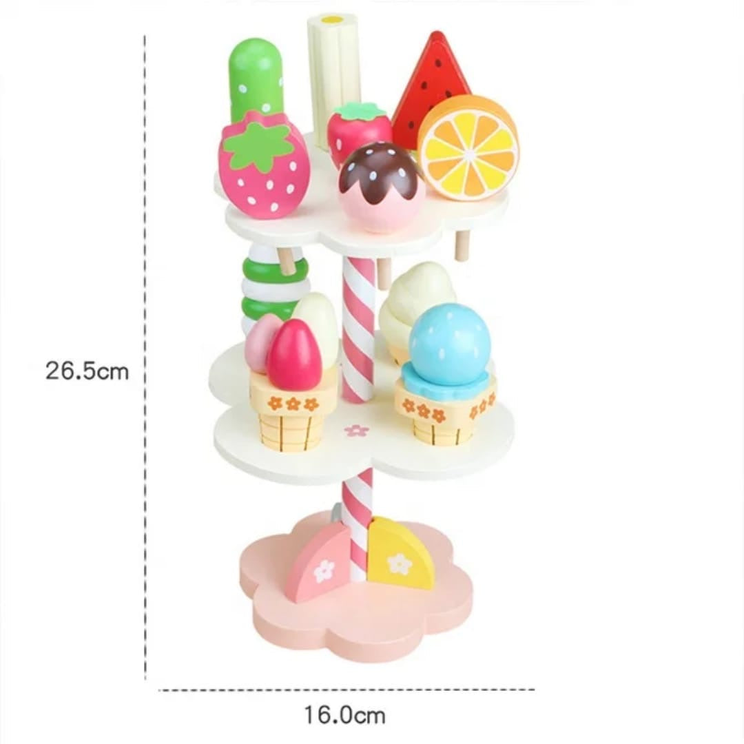 ice cream stand with various ice cream pieces. It is designed for children's pretend play and includes different flavors and styles of ice cream.