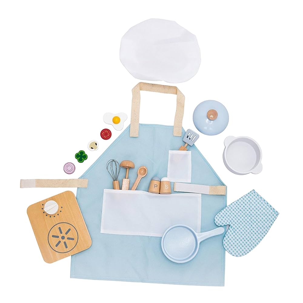 Super Cute Wooden Kitchen Accessories: A total of 18 pieces! This children's wooden toy set includes an apron, heat-resistant gloves, chef's hat, spatula, whisk, soup ladle, teaspoon, fried egg mold, tomato slice, mushroom slice, onion slice, cauliflower slice, salt shaker, pepper grinder, frying pan, stockpot, pot lid, and gas stove.
