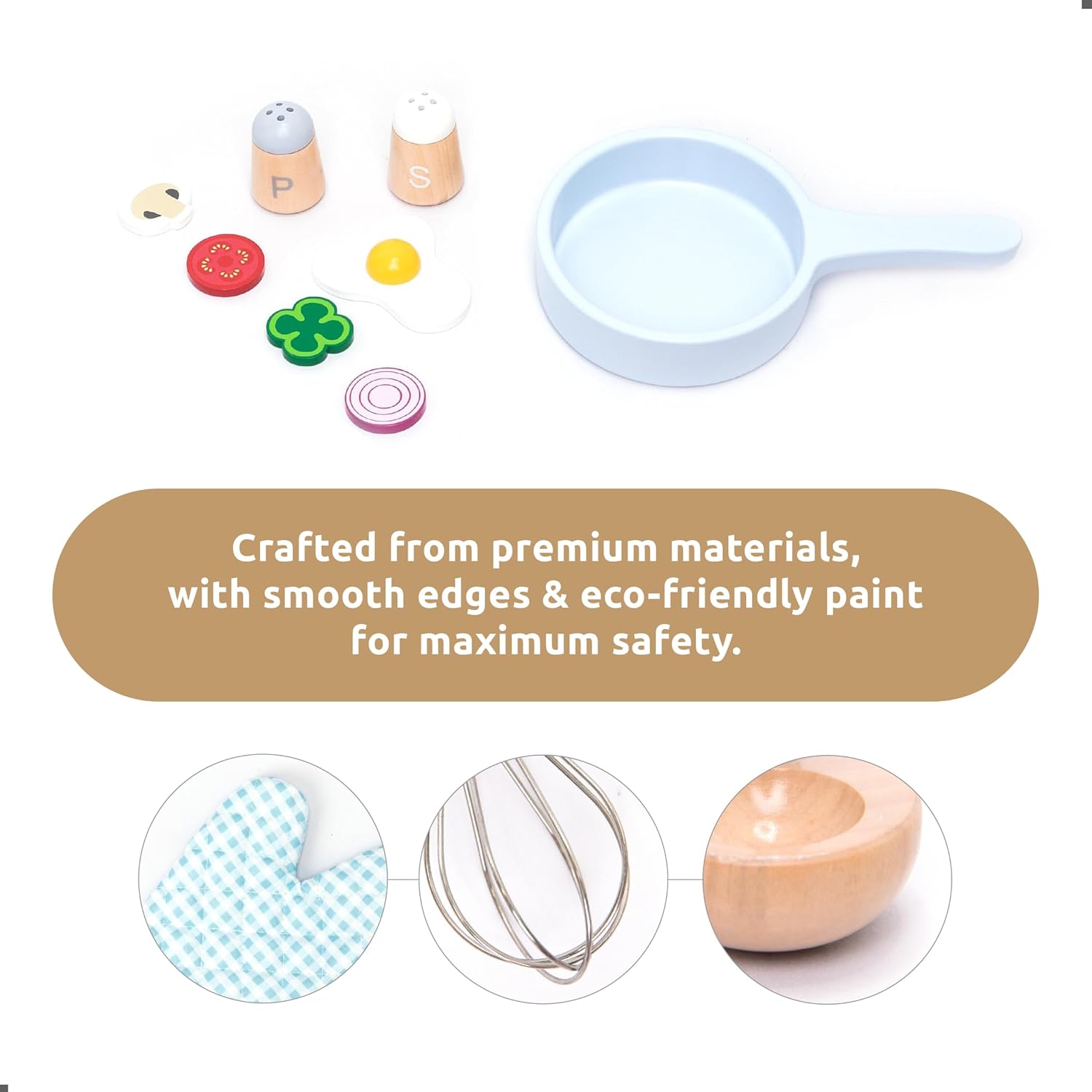 Make a Delicious Dish: Cook up a tasty meal with this realistic wooden play kitchen accessories set. Place your toy wooden frying pan on the toy gas stove, turn the side knob to hear a satisfying click, and flip your pretend fried eggs with the spatula.