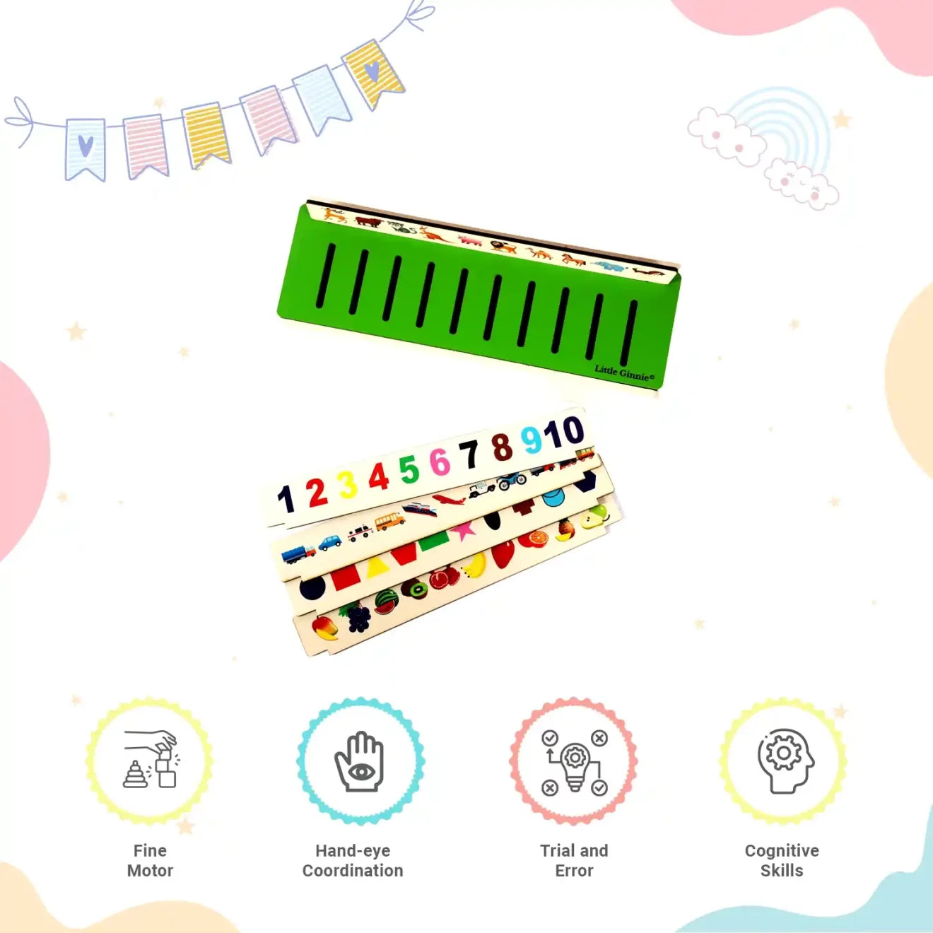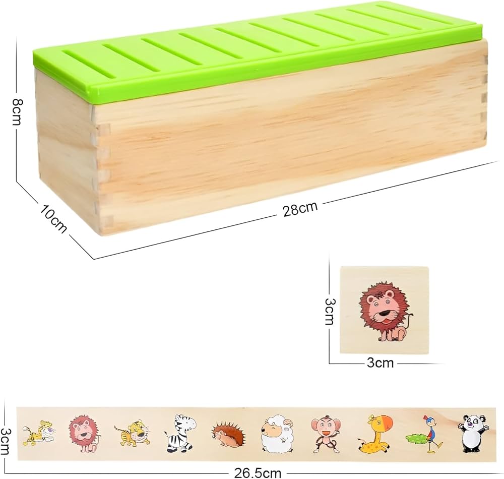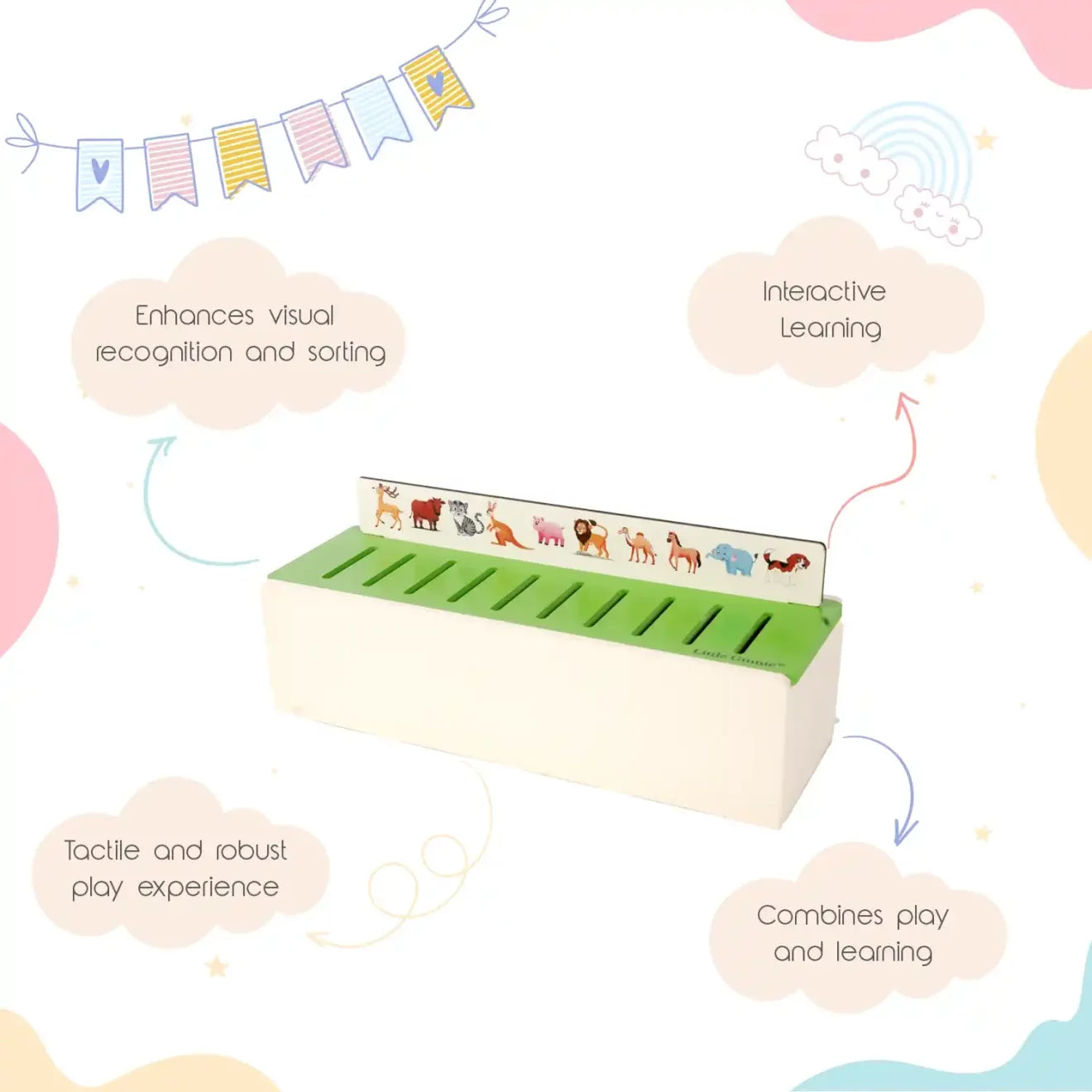 - Comprehensive set: includes a sorting box, five vibrant tiles, and 50 chips with themes like animals, transportation, and fruits.