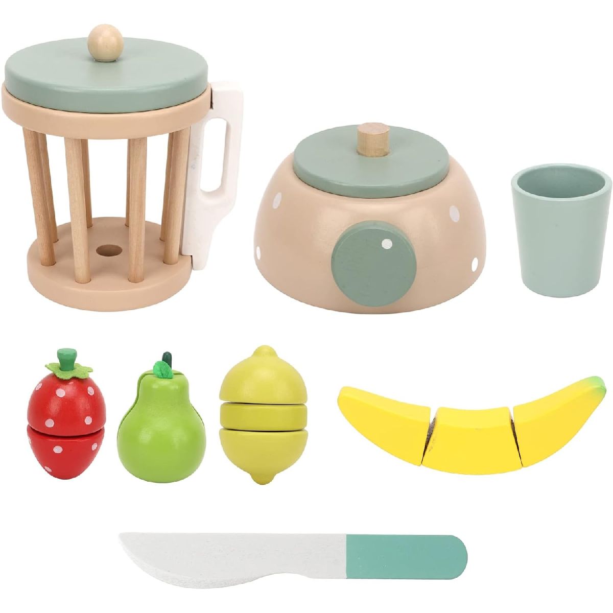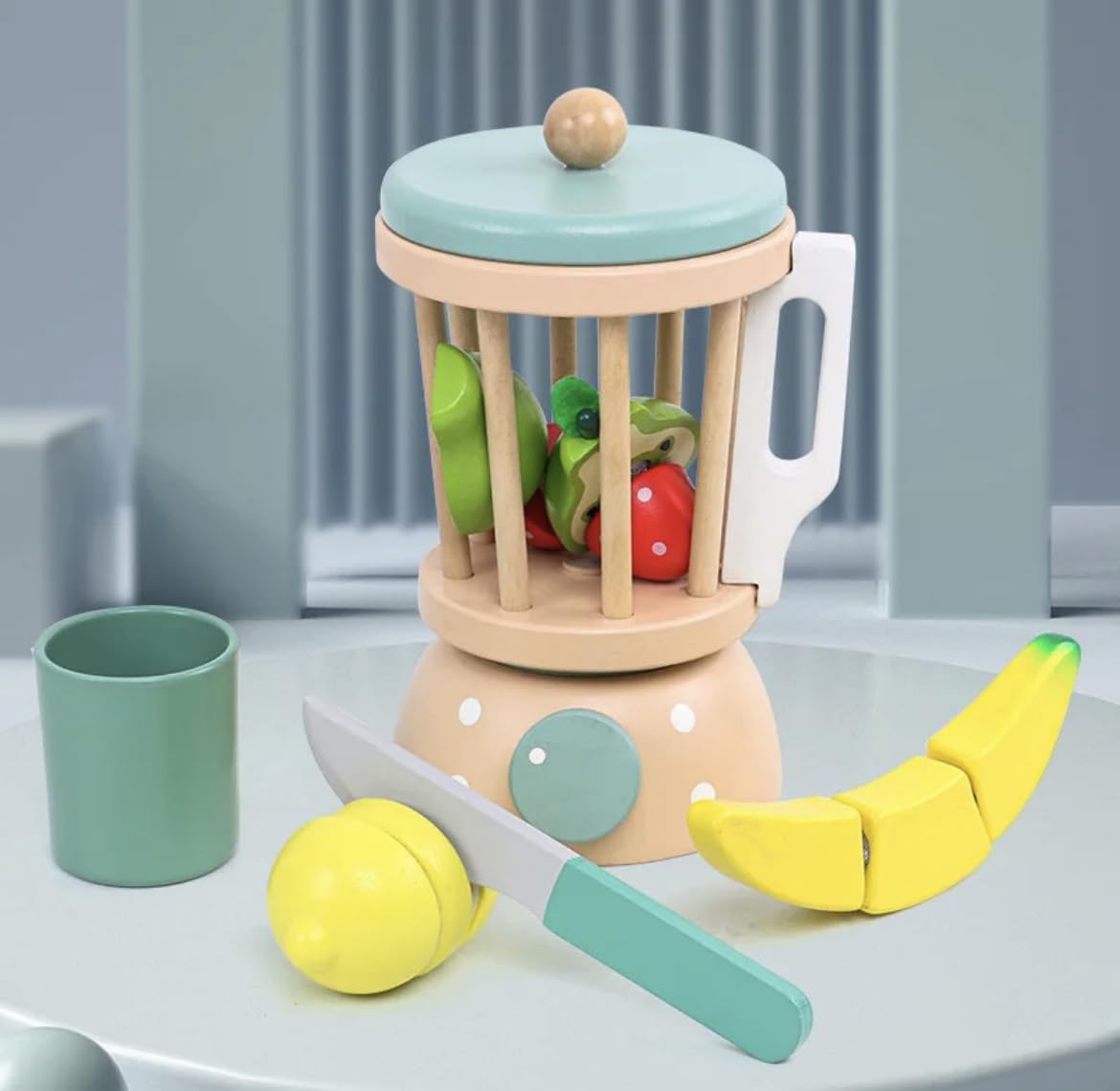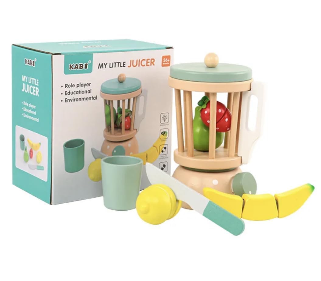 Crafted from high-quality wood and finished with non-toxic, child-safe paints, this playset ensures durability and safety for endless hours of fun. The lifelike design of the fruits, complete with velcro fasteners, provides a satisfying "cutting" sound when sliced, enhancing the immersive experience. This interactive play encourages fine motor skills, hand-eye coordination, and creative thinking as kids practice juicing their favourite fruits.