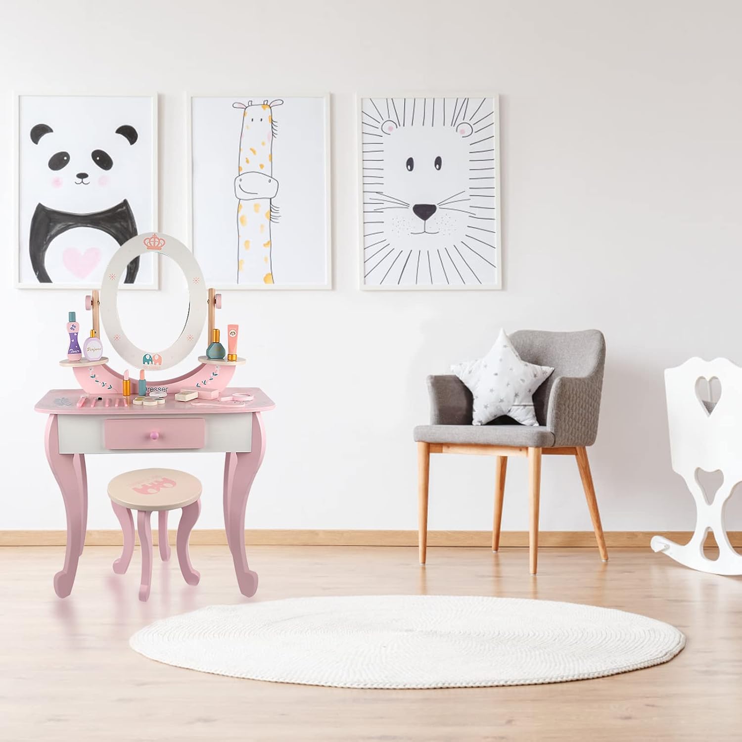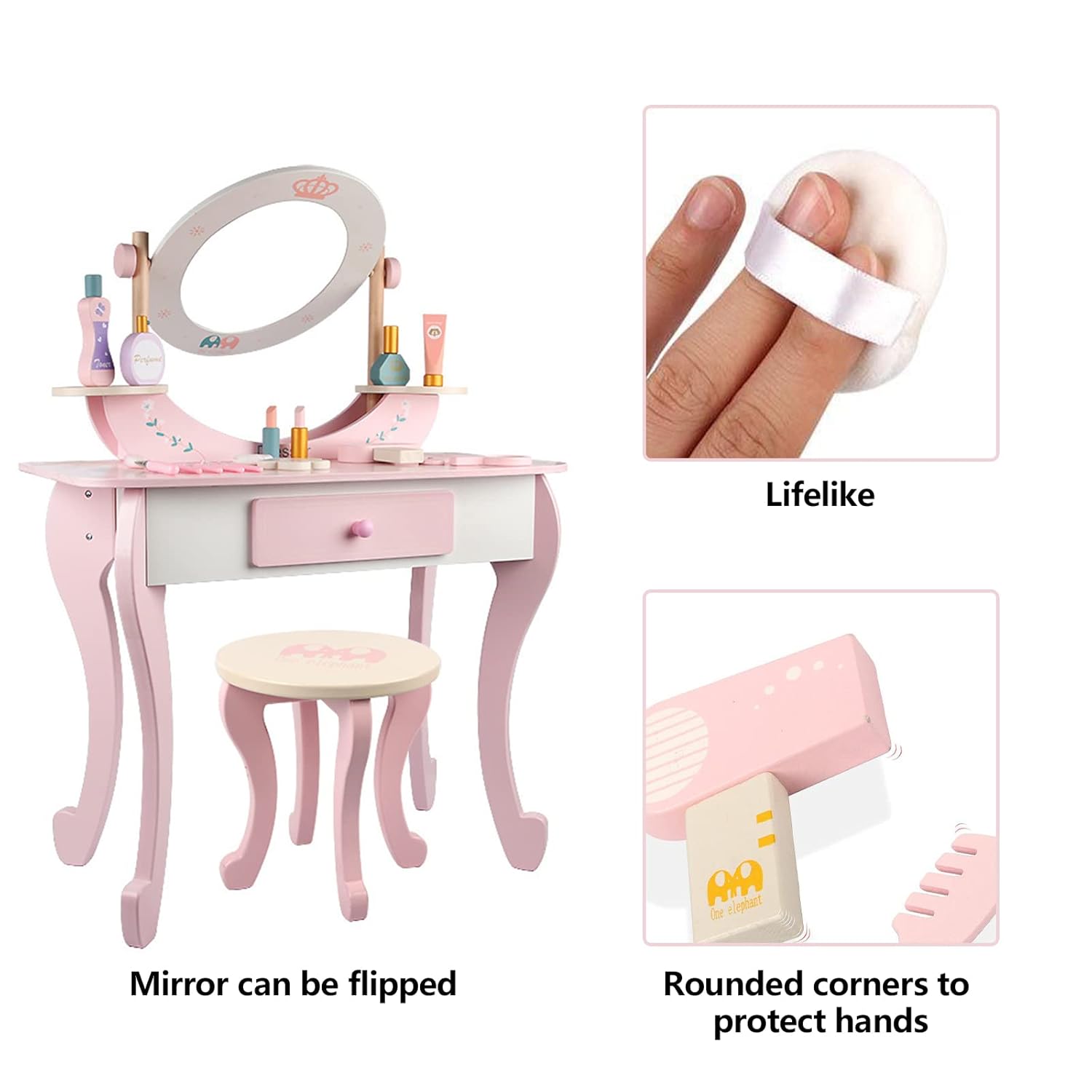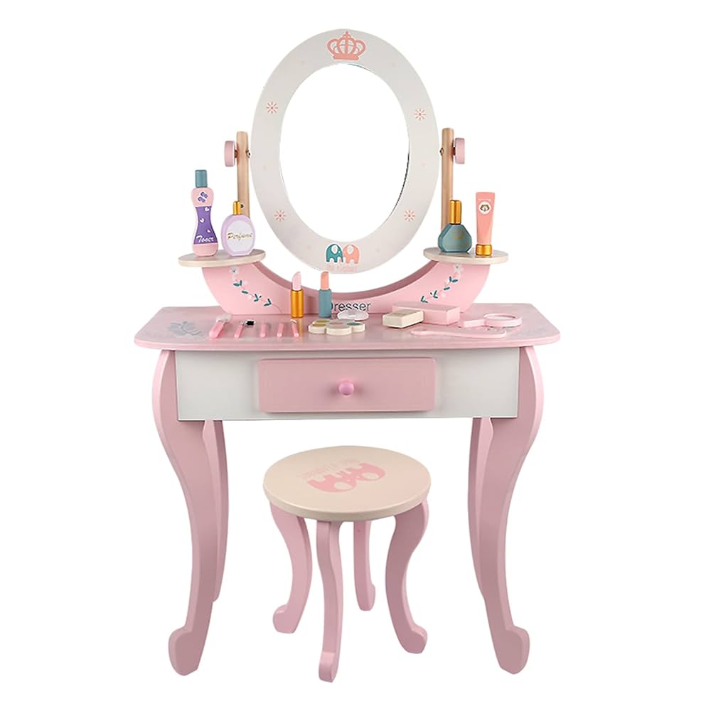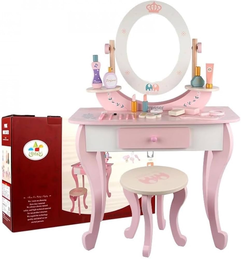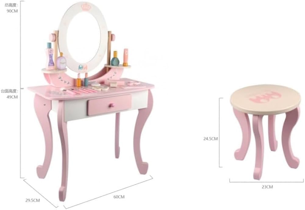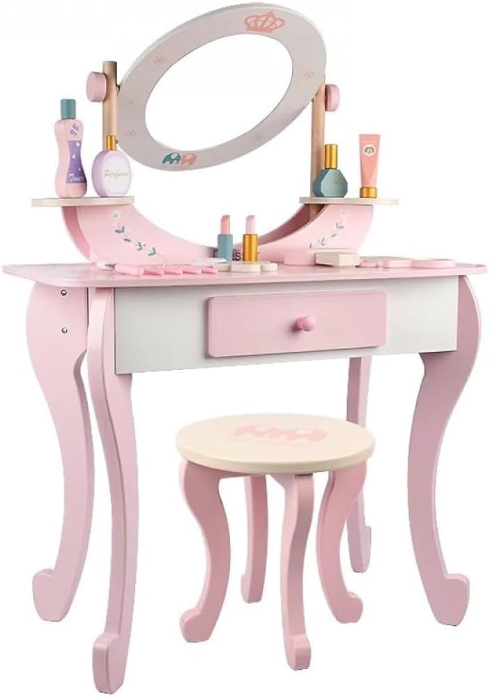 Kids will love admiring their style with a real vanity set sized just for them! New hairdos, lavish jewelry, perfect makeup, and shiny nail polish are just a handful of accessories kids can try outWhen makeover time is over, makeup, brushes, jewelry, and other items can be stashed in the built-in drawer or kept neatly on the ample desktop.Both the table and stool have been strength and safety tested to conform with astm F2613 consumer standards, because there's nothing fashionable about accidents! Rounded corners, shatter resistant mirror and drawer stopper; Safety is our priority.Even their room will look fashionable with the ornate, pink furniture in their decor. Great as a homework desk too