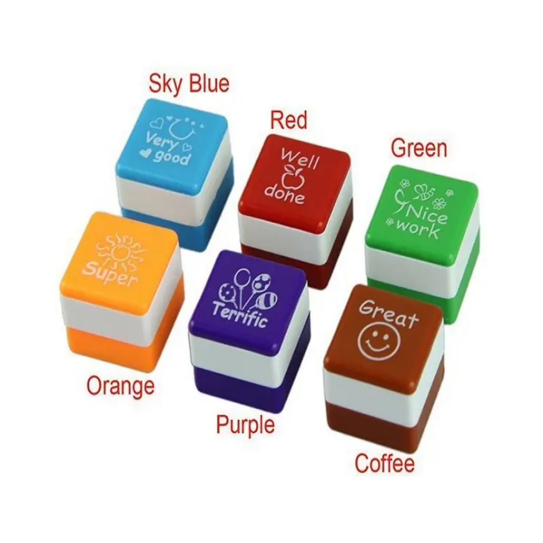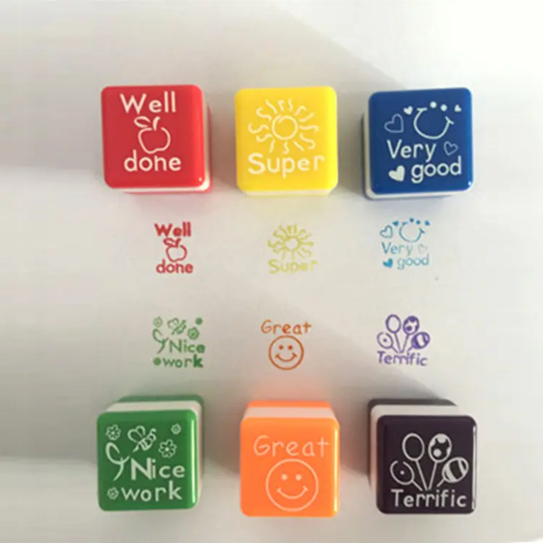 Design: Each stamp has a different color and encouraging message, such as "Very good," "Well done," "Nice work," "Great," "Super," and "Terrific".