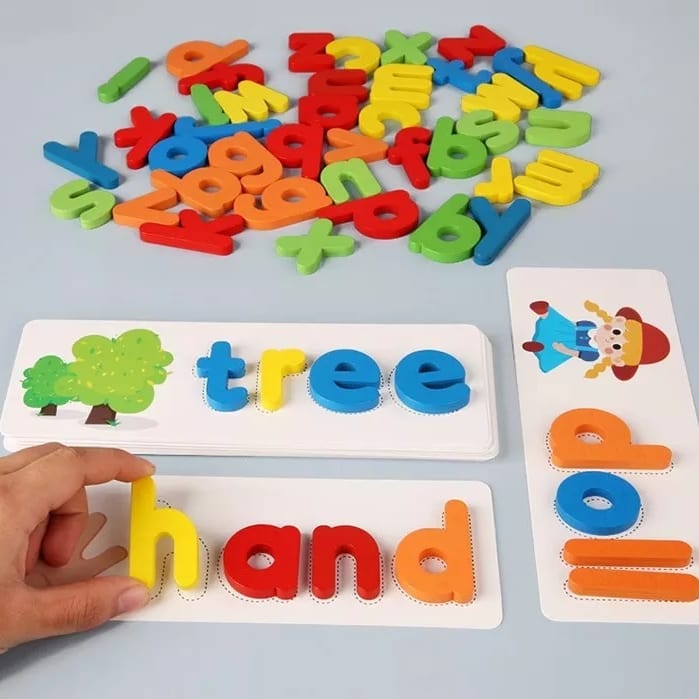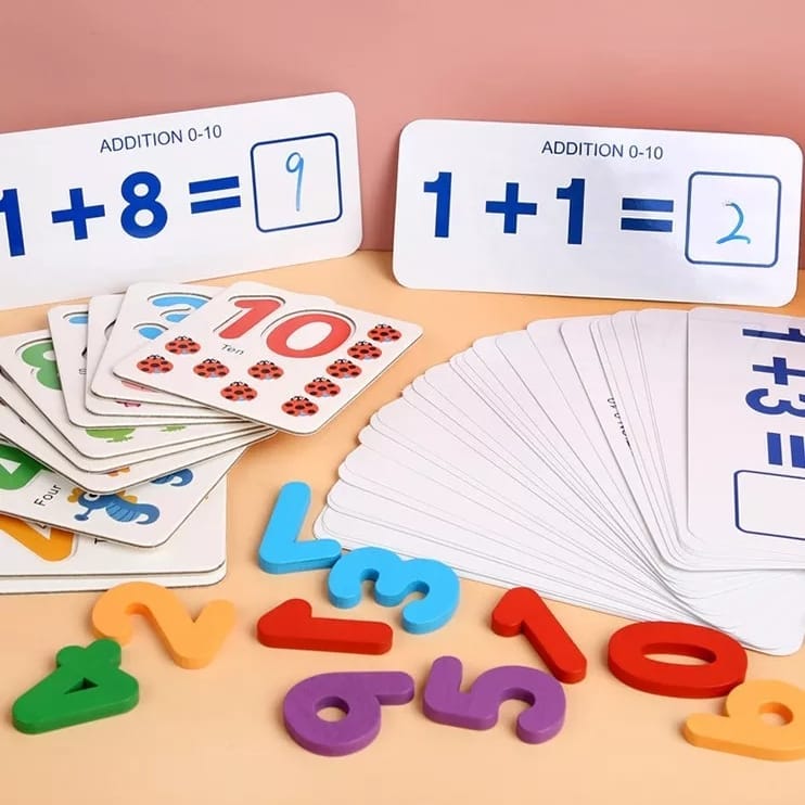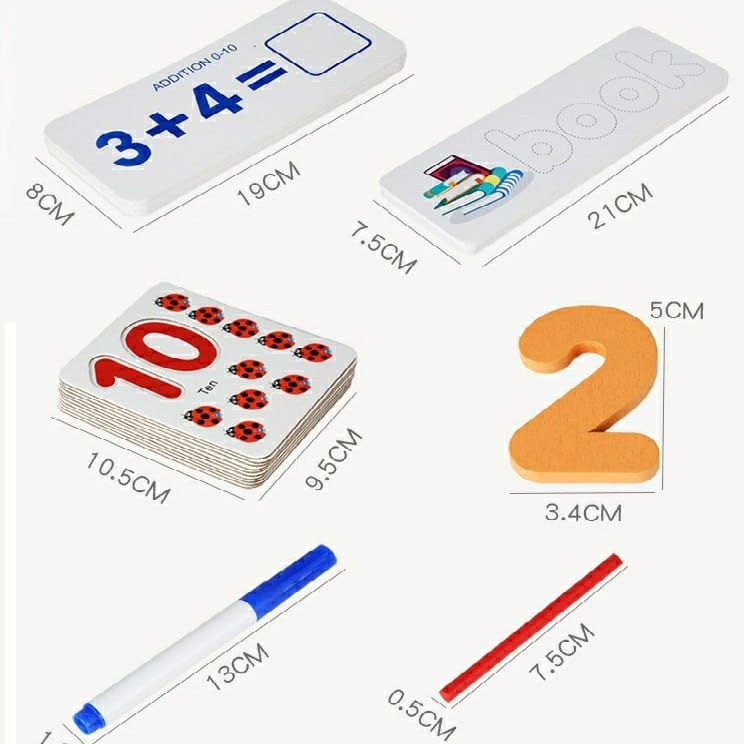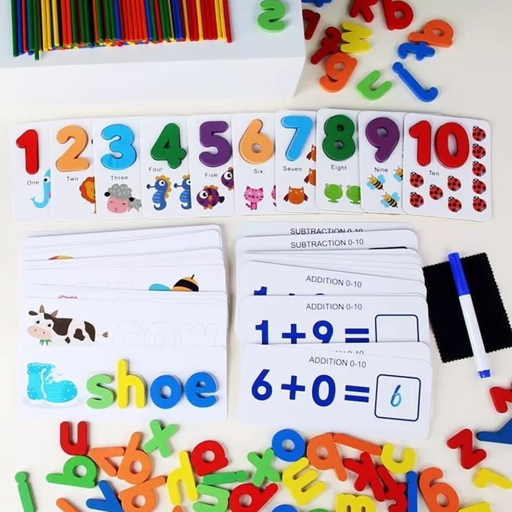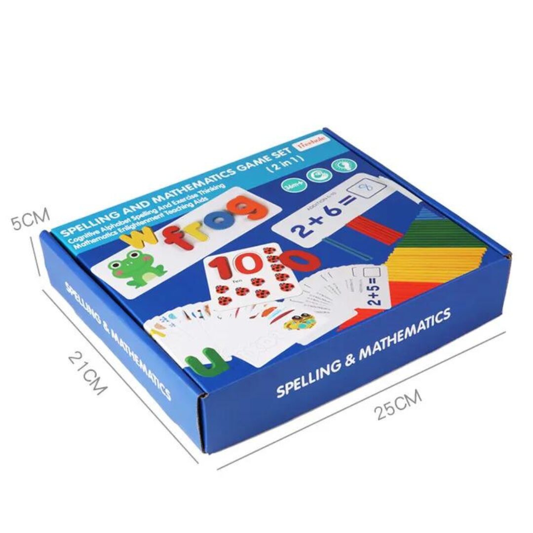The Spelling and Mathematics Game Set 2 in 1 is an educational toy that helps kids learn to spell and do math. It includes wooden sticks, number cards, and double-sided math and spelling cards.