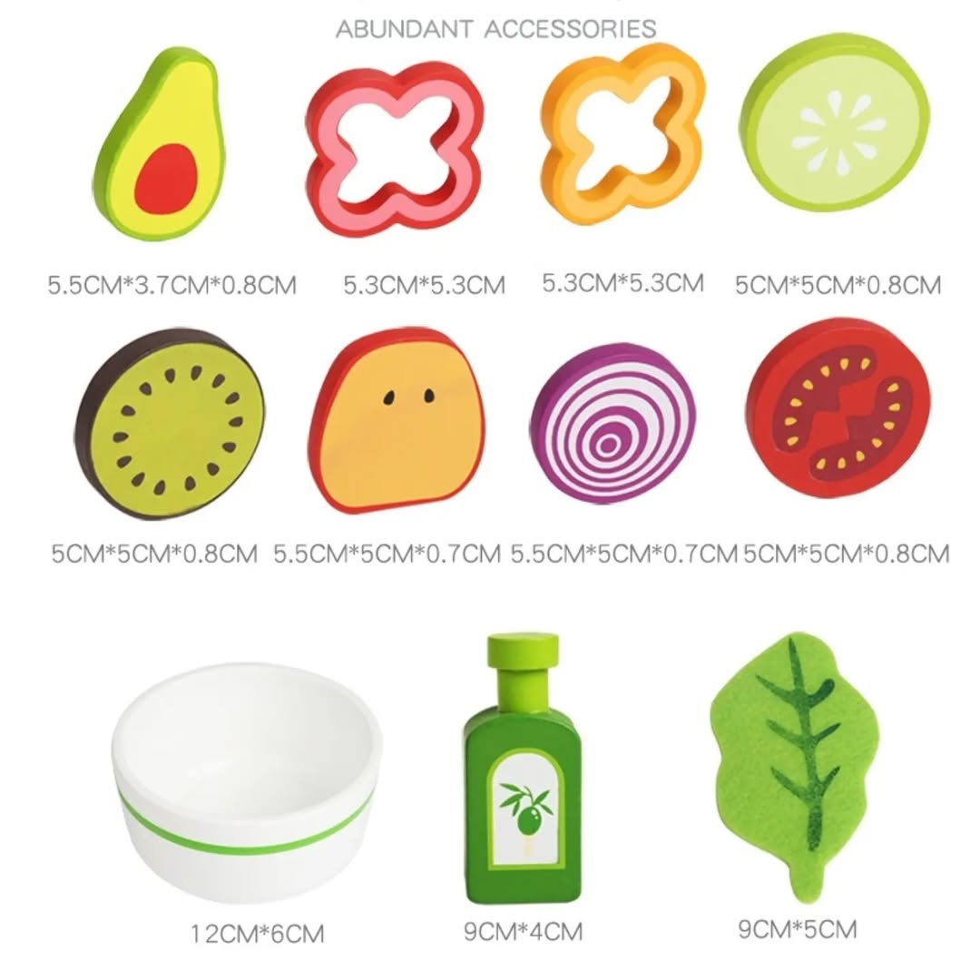 Wooden pieces painted with water-based paint, rounded pieces. The set contains: 1 bowl, a spoon, a bottle of oil, 18 slices of different vegetables and fruits.