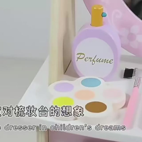 It typically includes a mirror, drawers, and various pretend makeup and hair accessories like combs, brushes, lipstick, and perfume bottles.