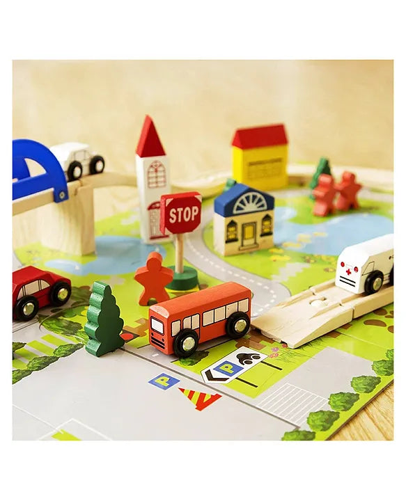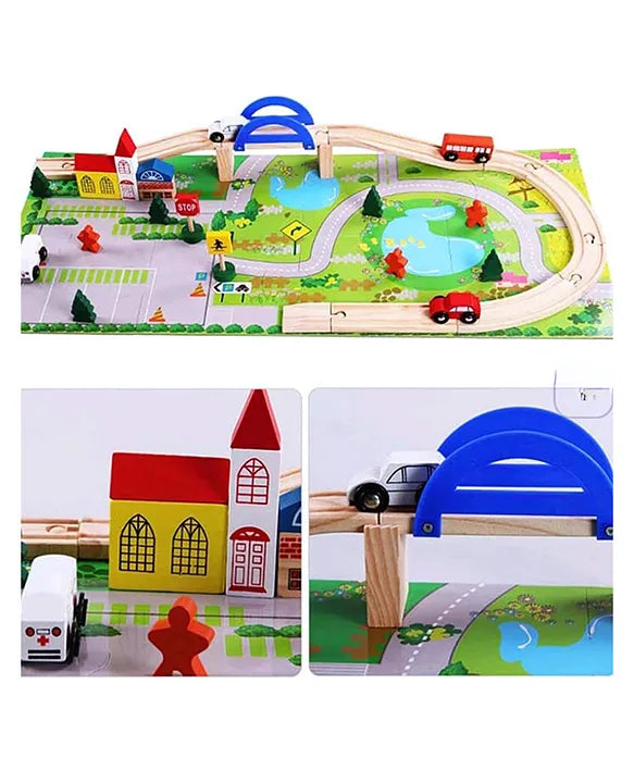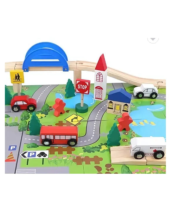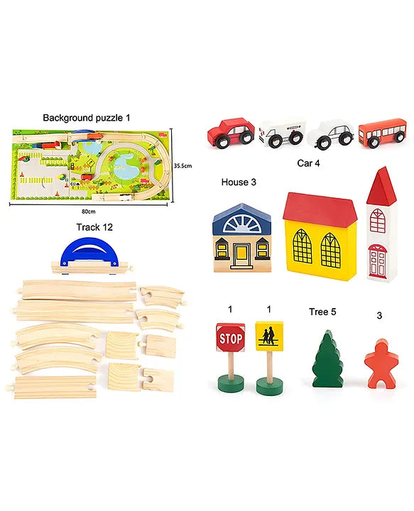 - COMPLETE WOODEN RAILWAY SET Includes wooden track pieces, an overpass bridge, puzzle playmat, scenic accessories, and wooden cars, making it a perfect starter or expansion set for young train lovers.